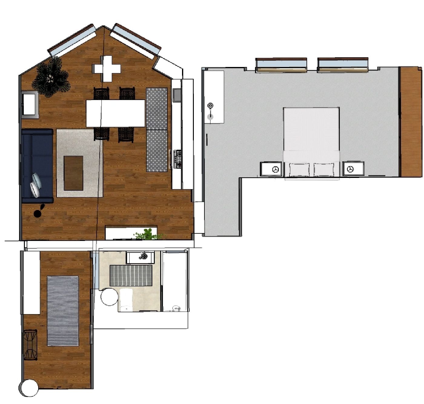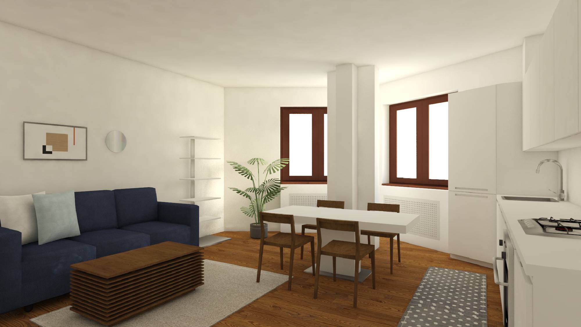 În imaginile de mai jos (obținute pe calculator), am încercat să transformăm un apartament în ceea ce am vrea să numim spațiu de locuit, un loc cald, intim, dar în același timp practic și deschis. Chiar dacă sunt doar niște imagini randate, vă asigurăm că totul a fost gândit minuțios, de la alegerea materialelor de construcție și până la procurarea mobilei și a decorațiunilor. Toate acestea, pentru a obține și respecta un design contemporan.
